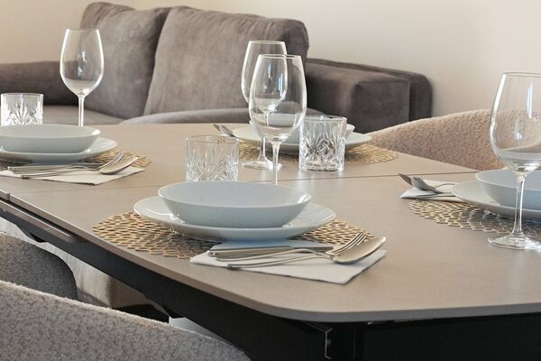 Unser Ferienapartment Top 2 im Erdgeschoss mit einer Größe von 60 m2 für 4 Personen ist mit 2 getrennten Schlafzimmern, großen Boxspringbetten inkl. Kleiderschränken, 1 geräumigen Bad mit Duschen inkl. Handtüchern und Haartrockner – einer voll ausgestatteten Küche mit einem großen Esstisch für 4 Personen – Geschirrspüler, Kühlschrank, Backofen, Wasserkocher, Kaffeemaschinen, schönem großen Wohnraum, großer TV, kostenloses WLAN, Klimaanlagen in jedem Zimmer, Terrasse mit einem Esstisch für 4 Personen voll