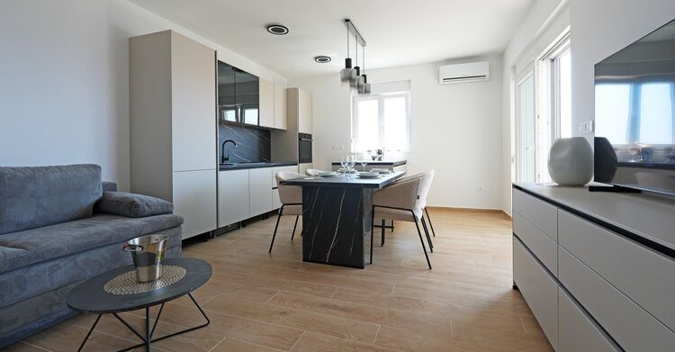Du hast zwei gemütliche Schlafzimmer, ein stilvolles Wohnzimmer mit Schlafsofa, eine komplett ausgestattete Küche mit Meeresblick – und natürlich WLAN und Klimaanlage. Hier findest du Ruhe, Raum und Inspiration.
